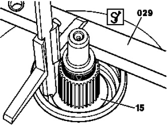 1 Place parallel support (029) on the transmission housing and measure with the depth gauge from the parallel support (029) to the park pawl gear (15).