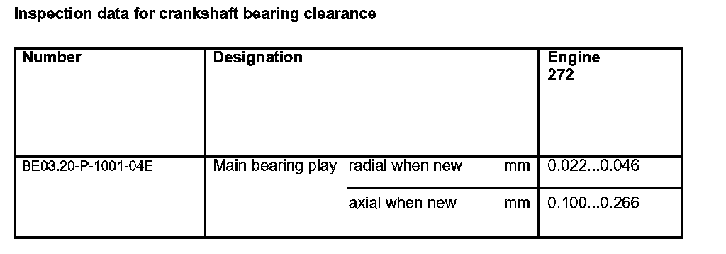 Inspection data for crankshaft bearing clearance: