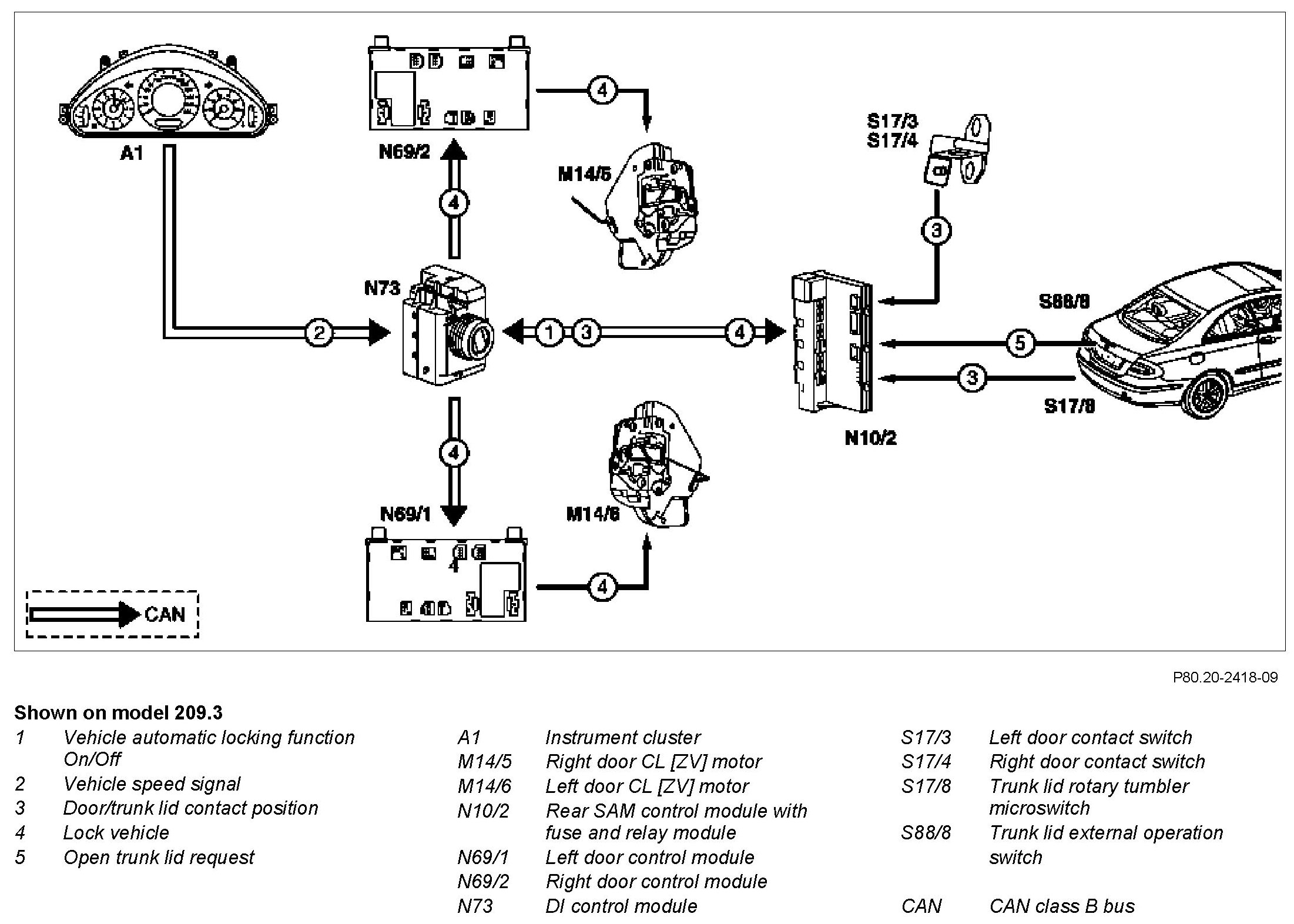 The EIS control module (N73) recognizes when the speed threshold is exceeded by evaluation of the speed signal on the CAN class B bus. In this case, the EIS control module (N73) sends the "Lock" command via the CAN class B bus to the left door control module (N69/1), right door control module (N69/2) and rear SAM control module with fuse and relay module (N10/2). These activate locking of the door locks and deactivate the request to open the trunk lid from the exterior trunk lid actuation switch (S88/8).