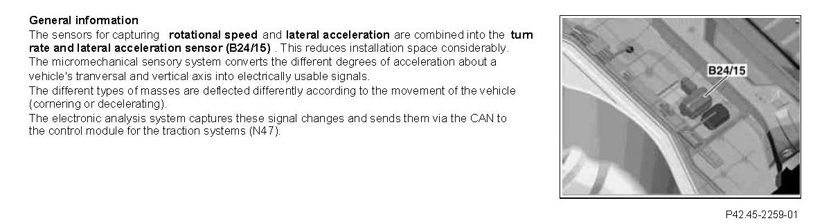 The sensors for capturing rotational speed and lateral acceleration are combined into the turn rate and lateral acceleration sensor (B24/15) This reduces installation space considerably. The micromechanical sensory system converts the different degrees of acceleration about a vehicle's transversal and vertical axis into electrically usable signals.