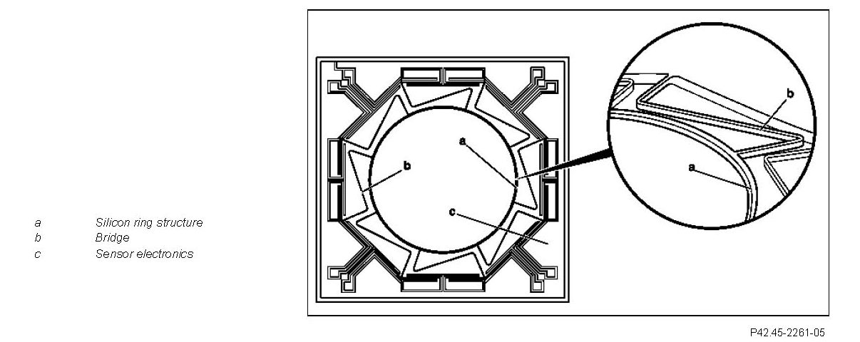 A micromechanical silicon ring structure (a) which has 8 bridges (b) to allow it to oscillate is used as the sensor element. The oscillations are induced electromagnetically. Rotation acting upon the oscillation structure generates additional forces (Coriolis) which are proportional to the active rotation.