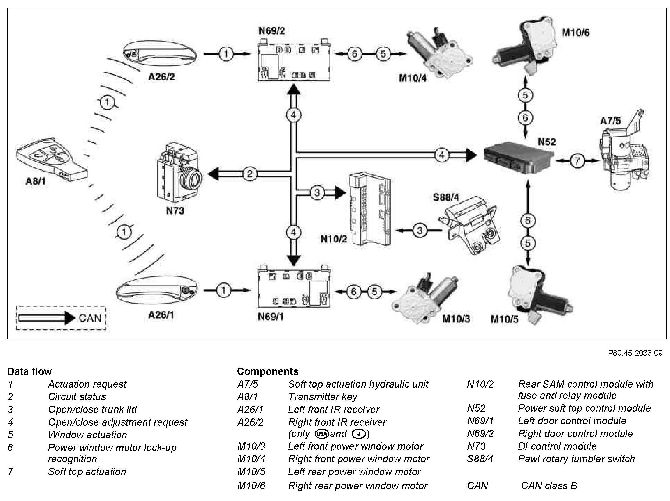 When the transmitter key (A8/1) is recognized the EIS control module (N73) transmits the request for "Closing" or "Opening" the window and the soft top to the left door control module (N69/1), t the right door control module (N69/2) and to the soft top actuation control module (N52) via the CAN class B bus.