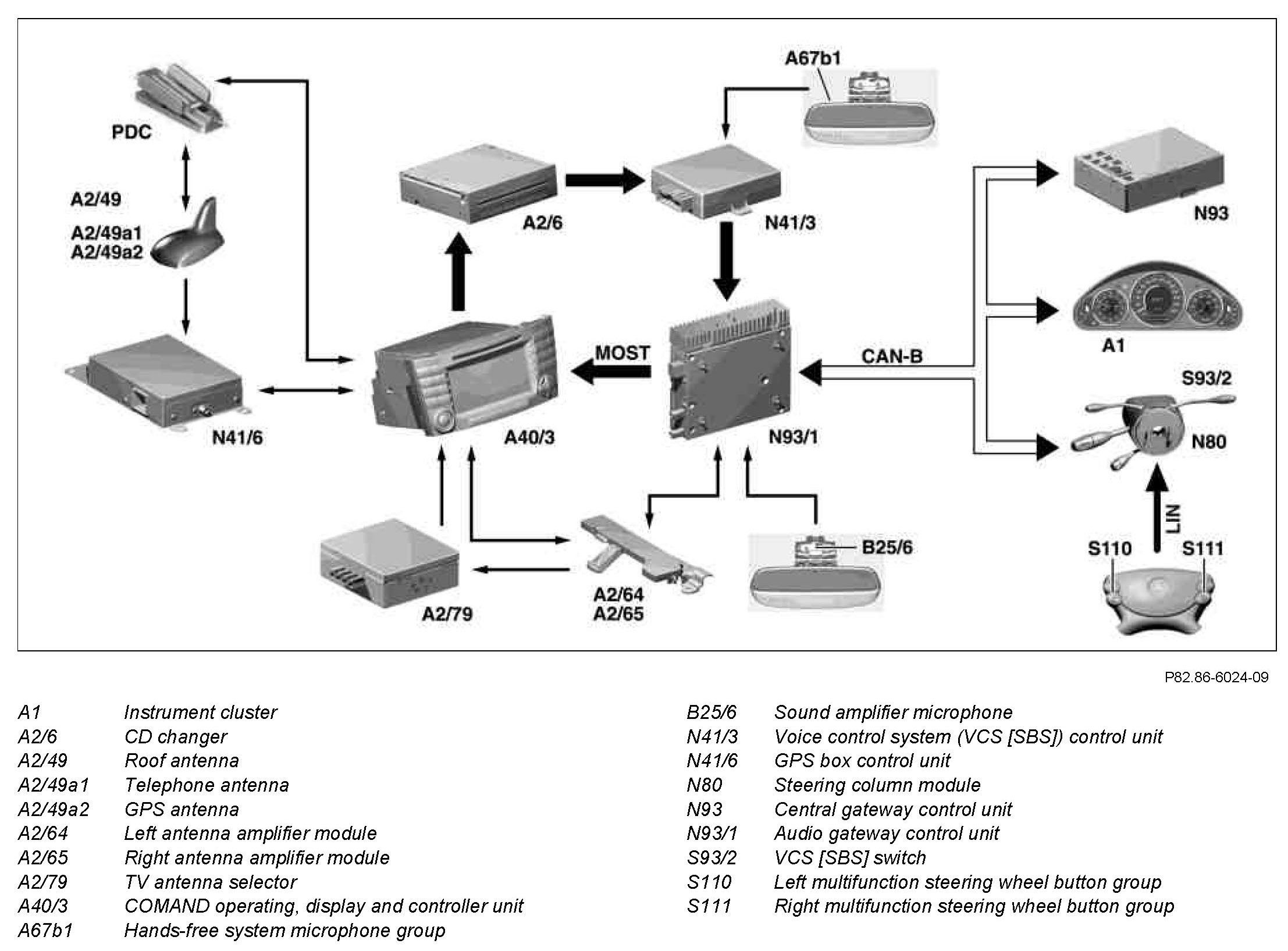 Data exchange takes place via the CAN-B between the COMAND operating, display and controller unit and the instrument cluster. Here the audio gateway control unit is the interface between CAN-B and MOST. These data bus systems are used by the instrument cluster to receive the audio, telephone and navigation data from the COMAND operating, display and controller unit for the multifunction display in the instrument cluster along with the time.