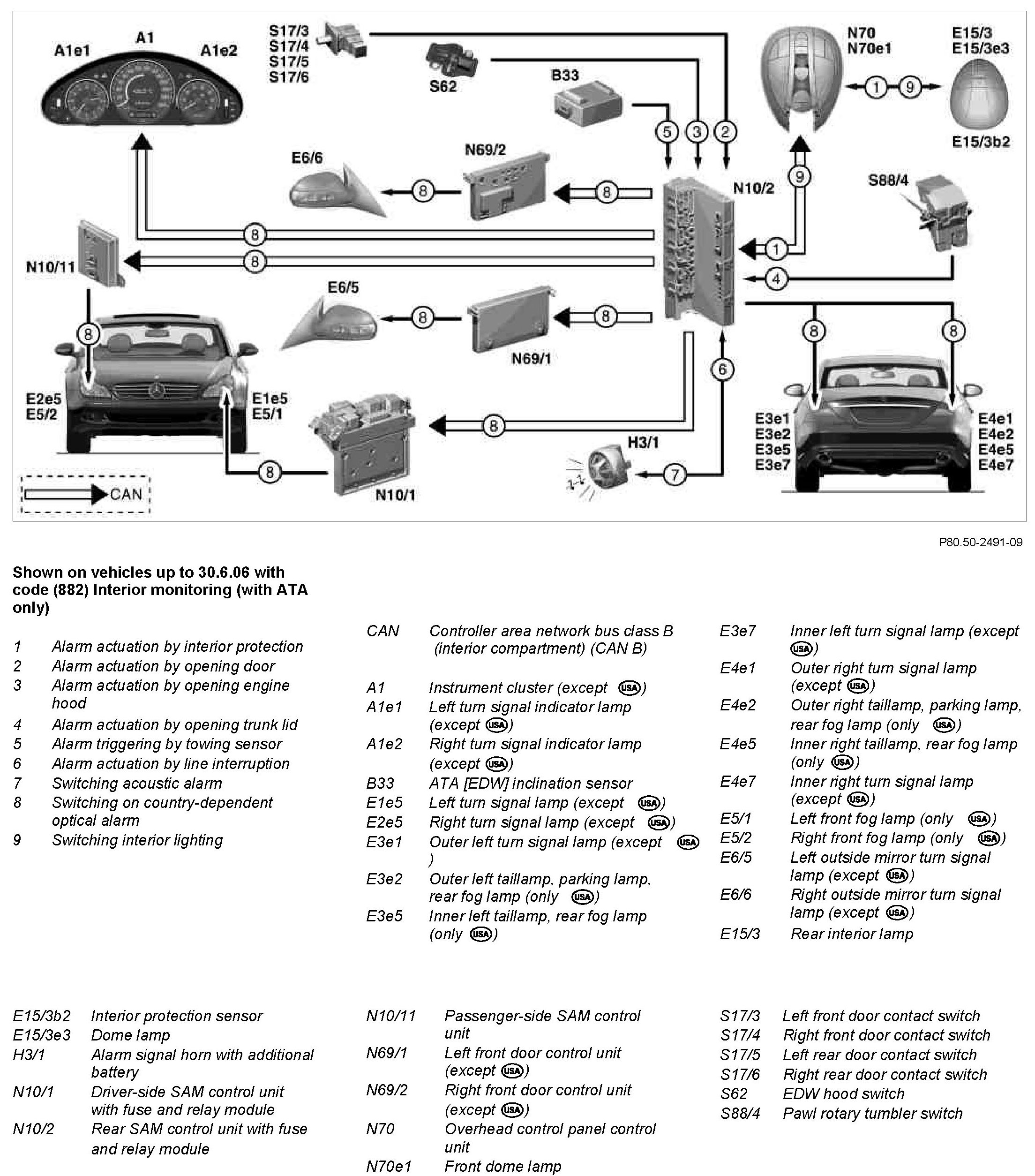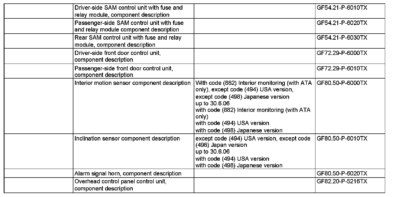 On vehicles with code (494) USA version or code (498) Japanese version, the components ATA inclination sensor, interior protection sensor and interior protection switch will be discontinued as of 1.07.06.