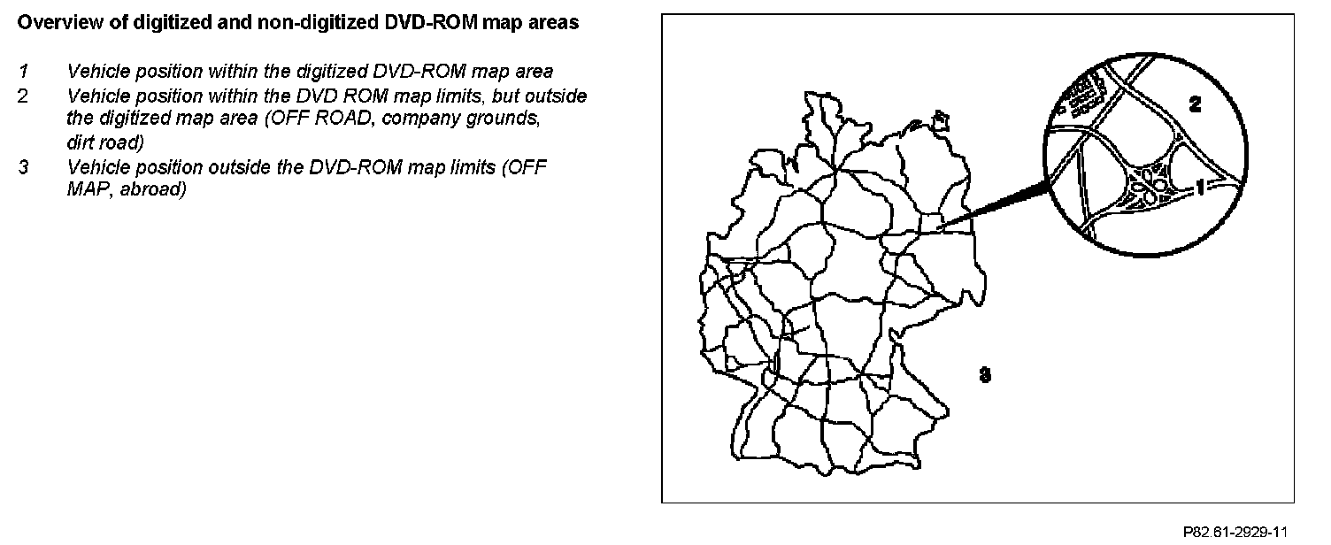 Map-based position finding is only available in the digitized area of the DVD ROM map. By comparing the calculated position of the vehicle with the DVD ROM map, the deviation can be detected and automatically corrected.