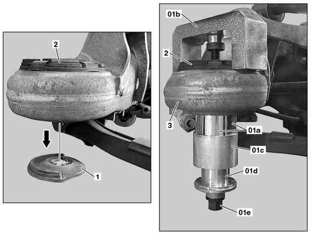 5 Press rubber mount (2) out of rear axle carrier (3) by turning in the spindle (01e).