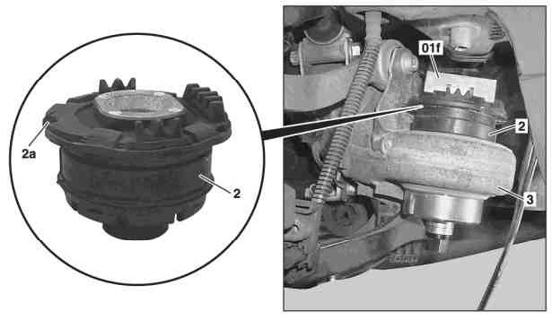 2 Insert thrust pieces (01a) in the gap between the rubber mount (2) and rear axle carrier (3)