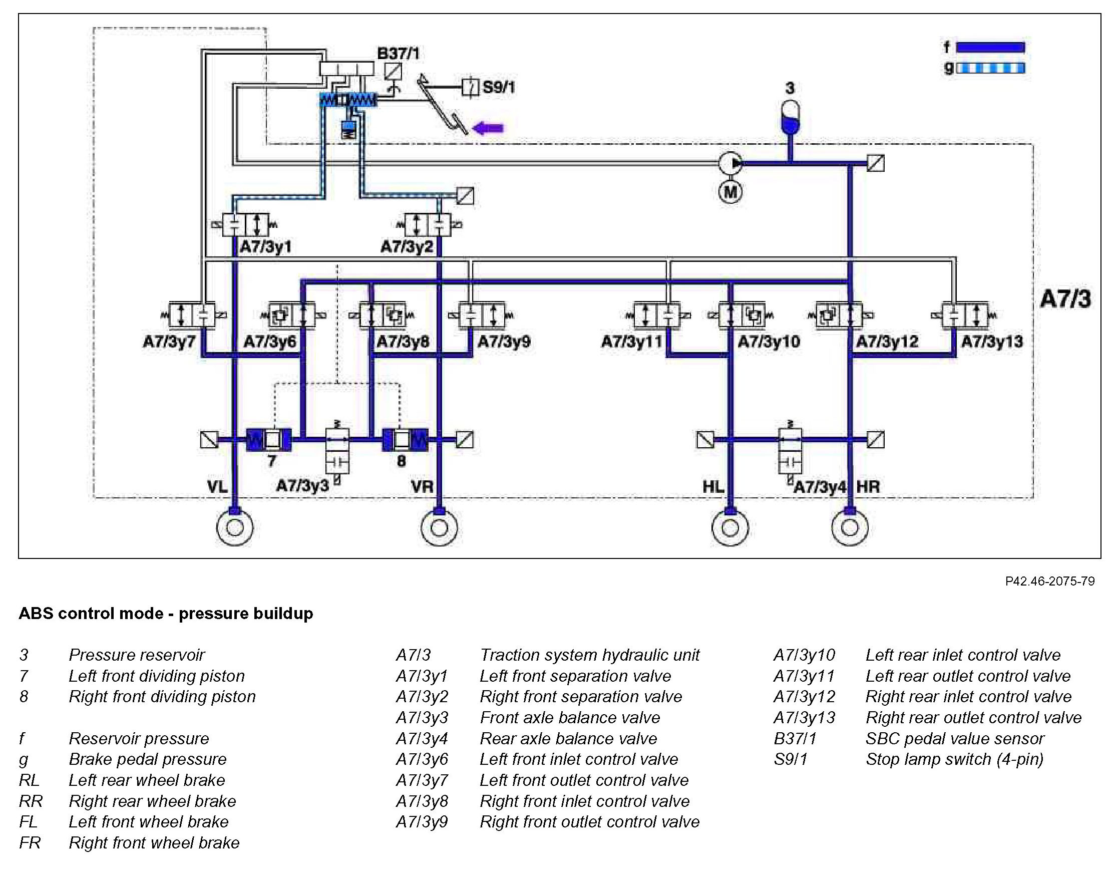 Each ABS control phase begins with normal application of the brakes when the driver presses the brake pedal. The SBC control unit (A7/3n1) calculates the brake pressure and starts with the control.