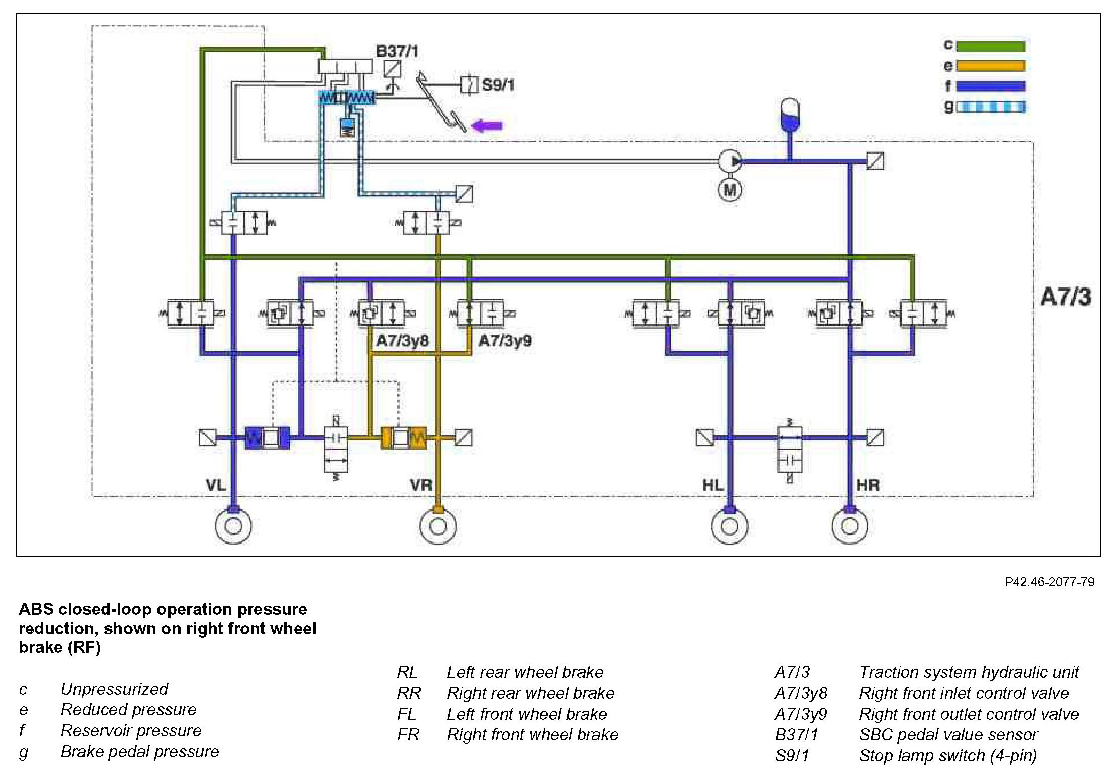 The control process shown in the example and the valve positions refer to the right front wheel brake (FR).