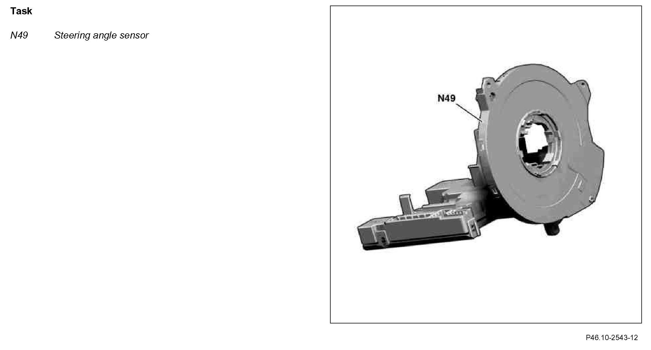 The steering angle sensor (N49) is integrated into the steering column module (N80). The steering column module is located on the steering column behind the steering wheel in the interior compartment.