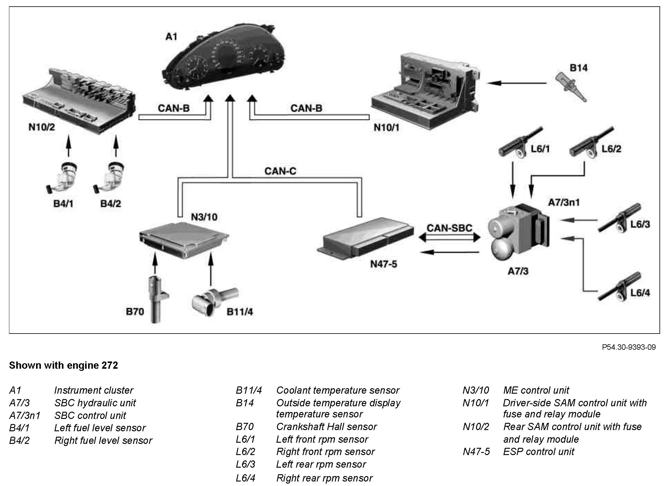 The instrument cluster receives the wheel speeds in rpm from the ESP control unit via the Controller Area Network bus class C (engine compartment) CAN-C. The electronic speedometer (A1p8) with its speedometer arc displays the vehicle speed