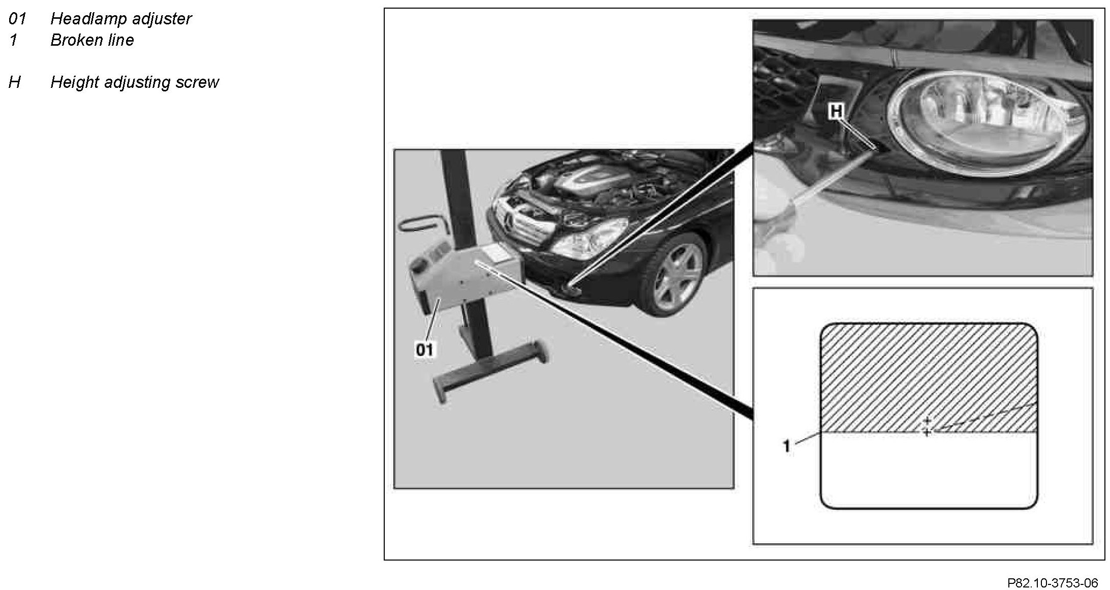 The light-dark boundary of the light bundle must run horizontally along the broken line (1) in the headlamp adjusting and testing device (01).