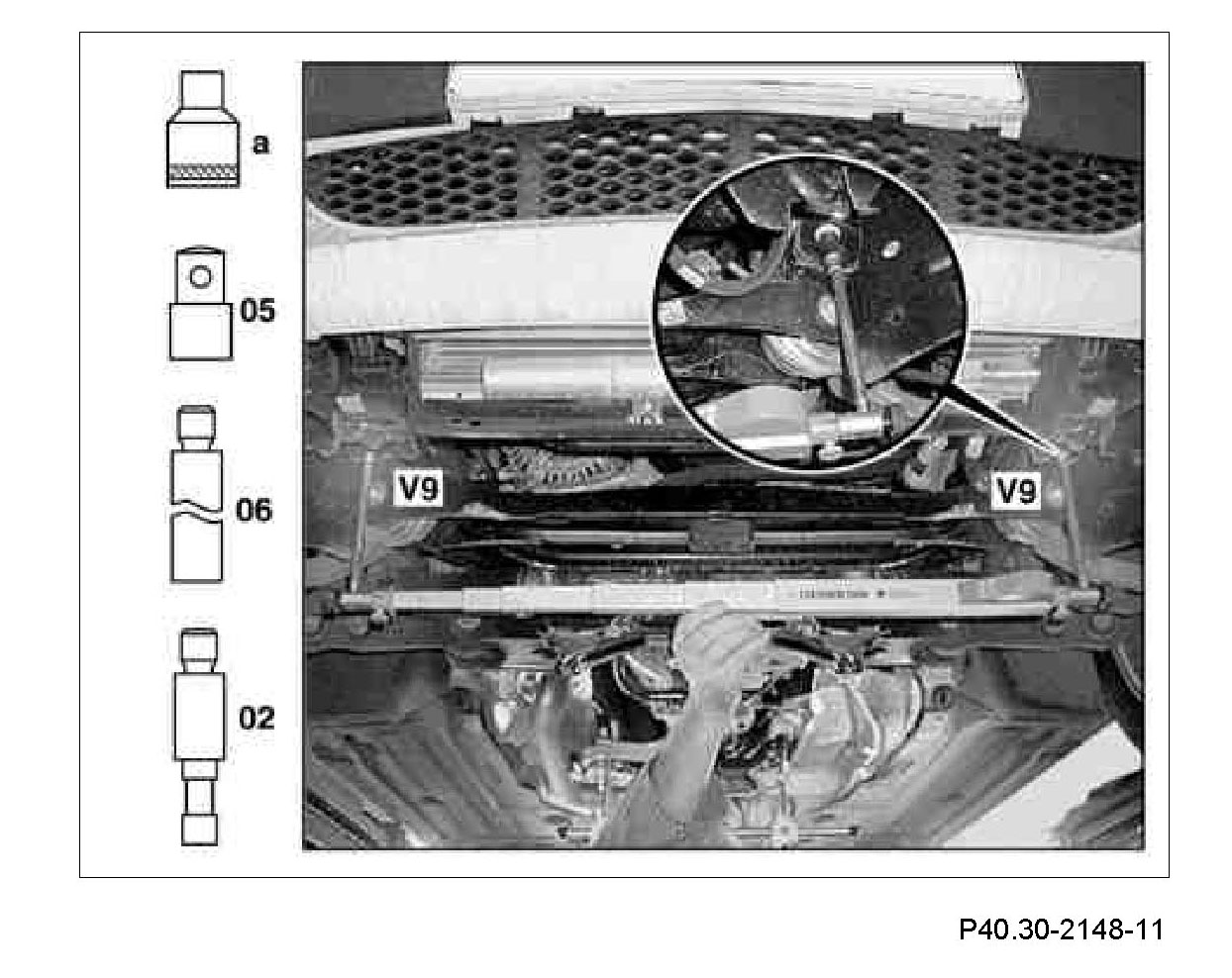 6 Measure distance dimension (V9) from the centering point of the Torx bolt heads between the front bearings of the front axle carrier.