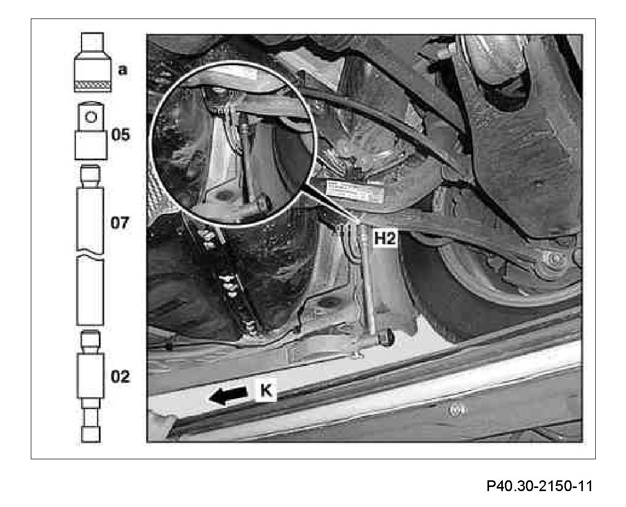 1 Measure comparative measurement (H2) from check point (K) to centering point of the Torx bolt head of the front mount of the rear axle carrier, left to right.