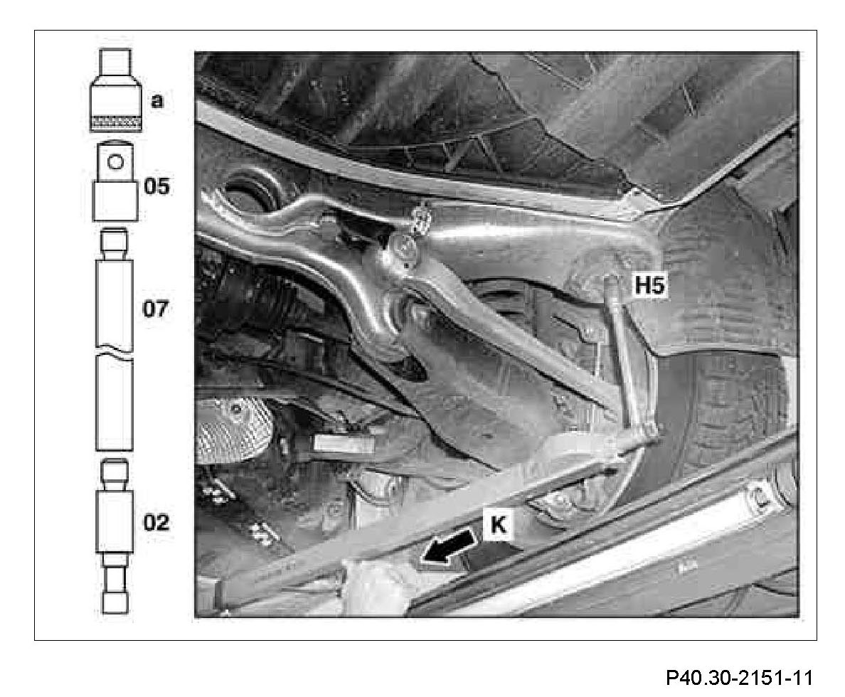 2 comparative measurement (H5) from check point (K) to the centering point of the Torx bolt head of the rear mount of the rear axle carrier, left to right.