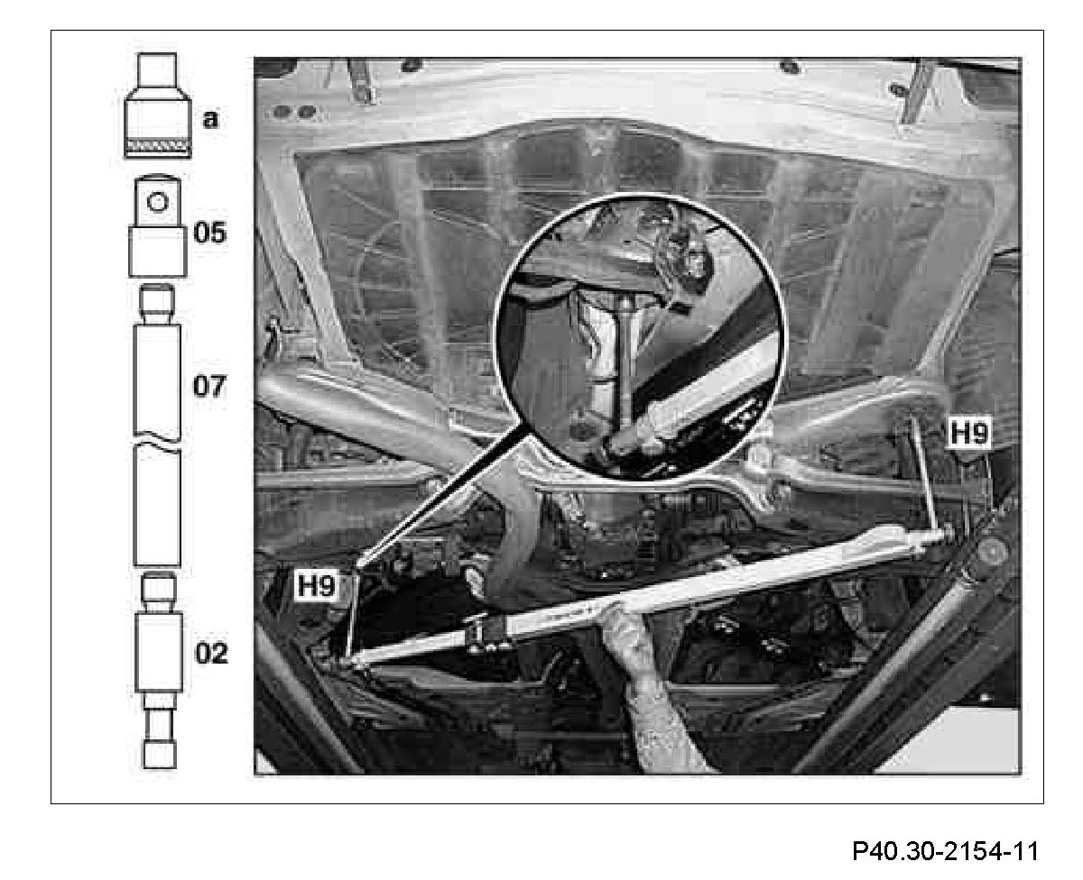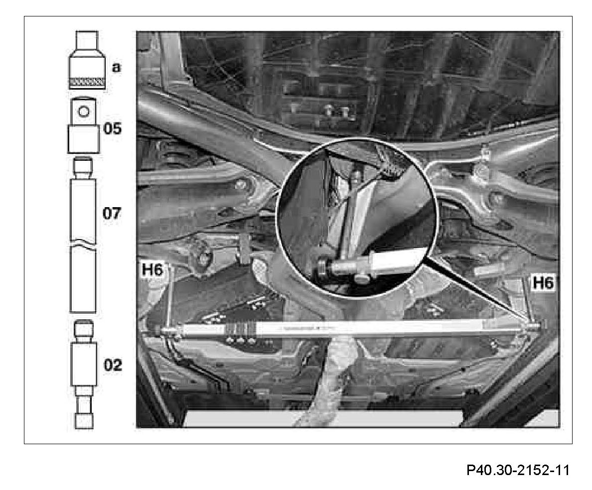 5 Measure comparative measurement (H9) diagonally from the centering point of the Torx bolt heads between the front and rear mount of the rear axle carrier, left to right.