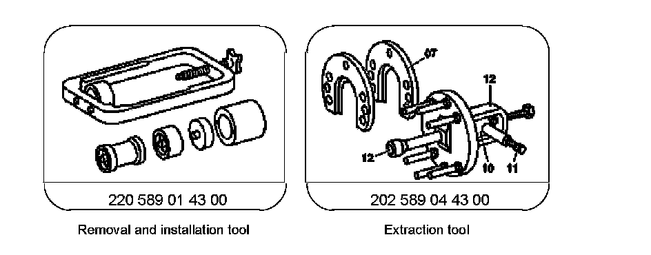 9 Attach extractor and Press-in tool with thrust piece (068g) and press (010h) onto rear axle carrier.