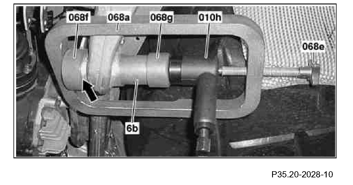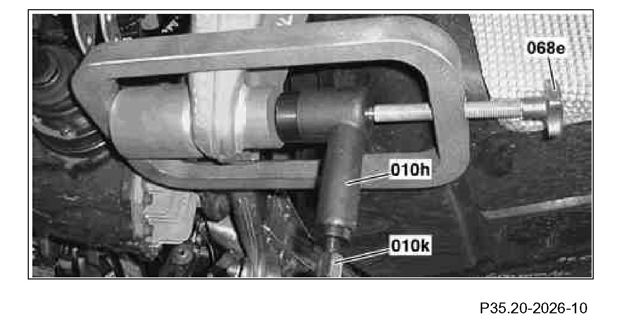 5 Press rubber mount part of the way out until the thrust piece (068c) lies against the rear axle carrier (arrow). To do this screw in the pressure screw (010k) of the press (010h). If the rubber mount is difficult to move, strike the bracket firmly.