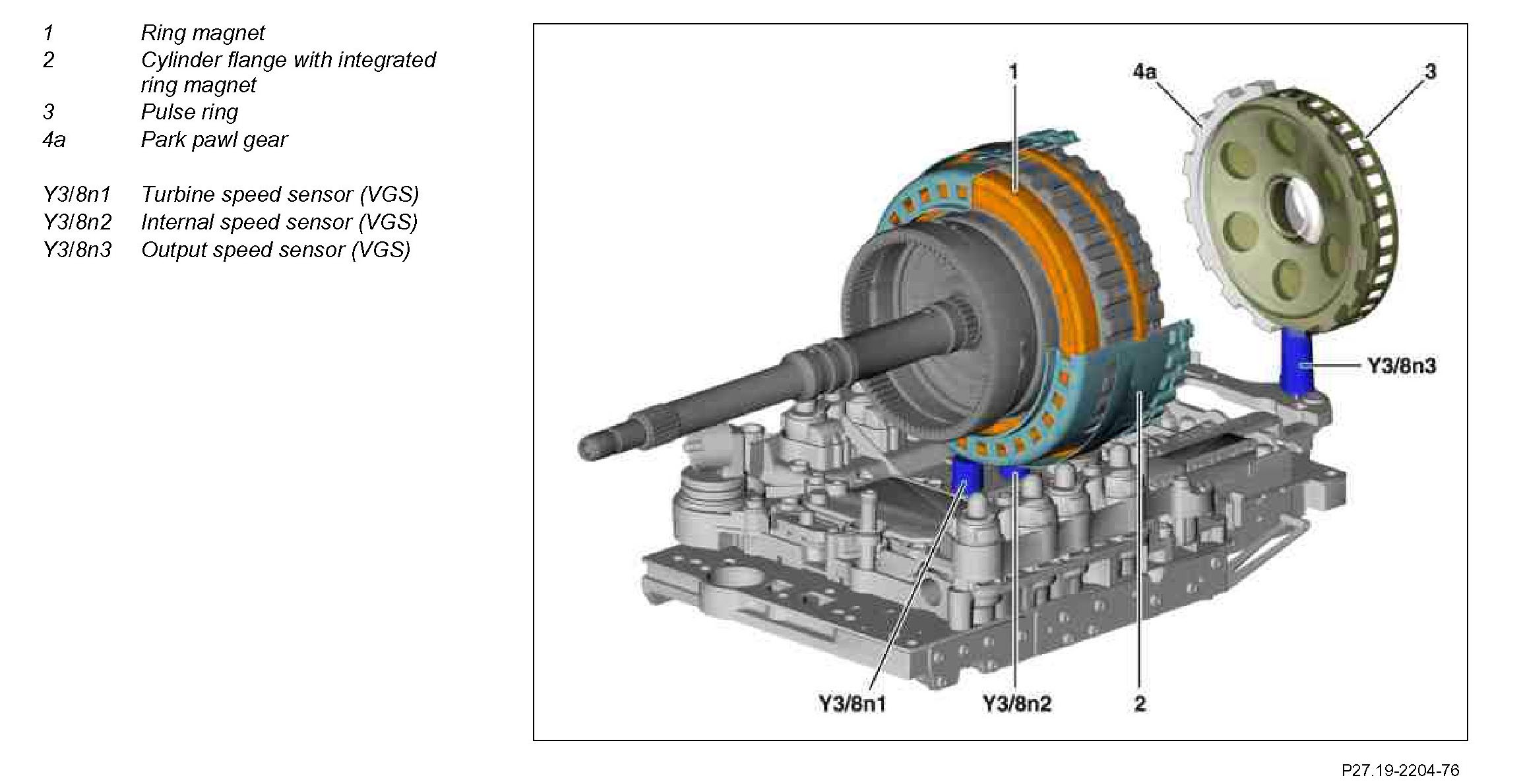The turbine speed sensor (VGS) (Y3/8n1) records the rotational speed of a ring gear of the Ravigneaux set for the fully integrated transmission control (VGS).