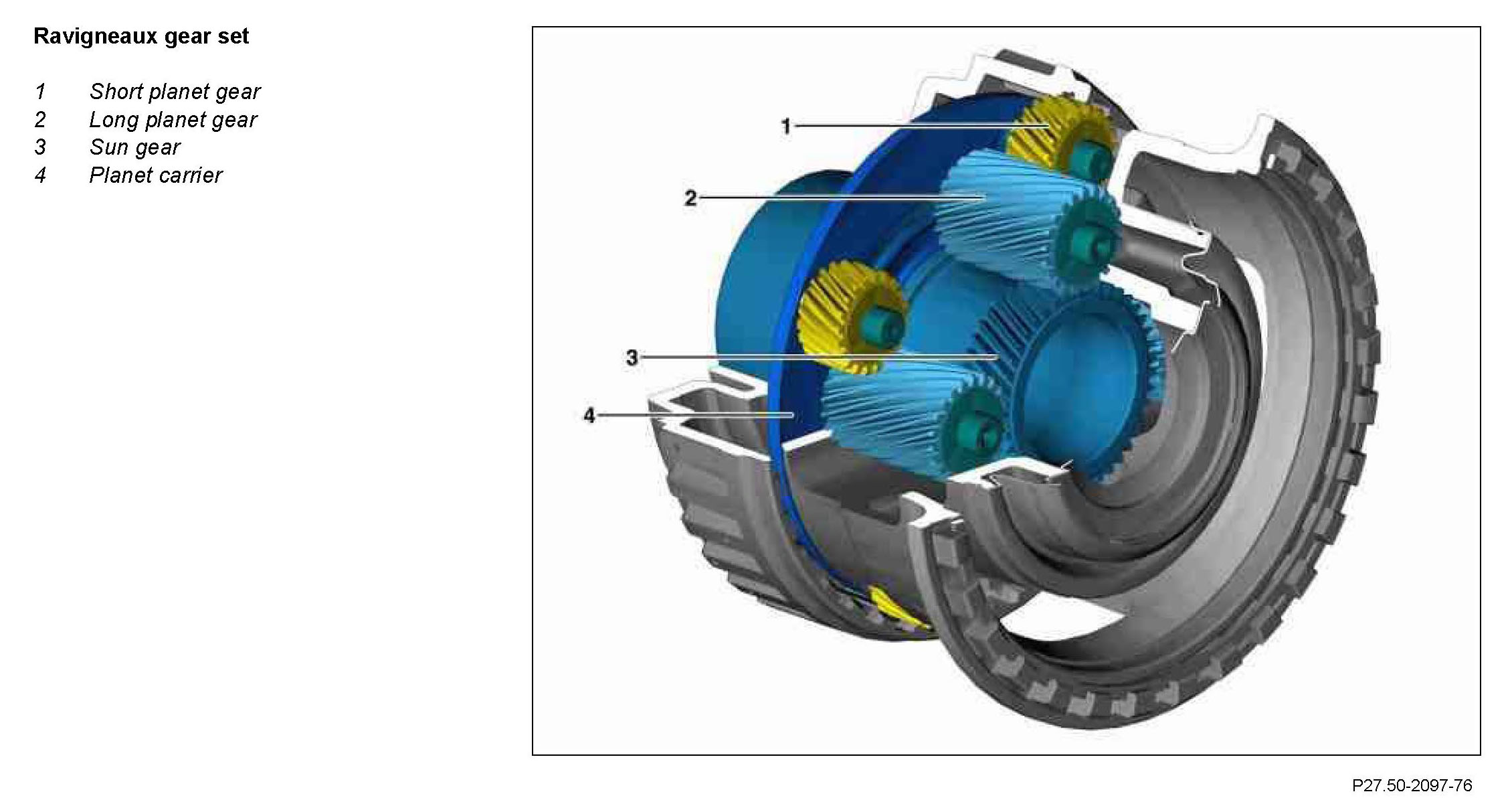 If 2 components of the Ravigneaux gear set are rigidly connected to each other, the planetary set is blocked and rotates as a closed unit.