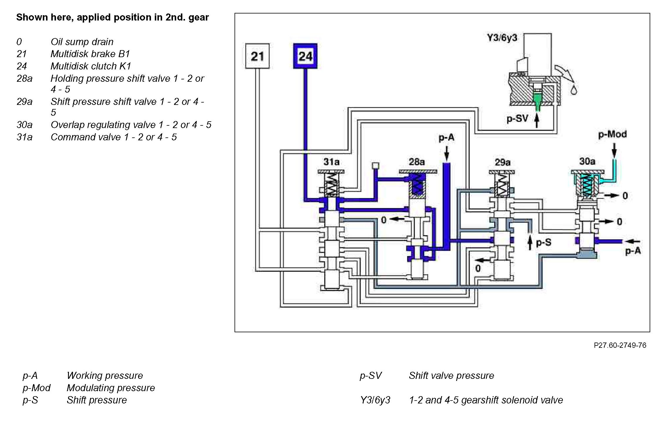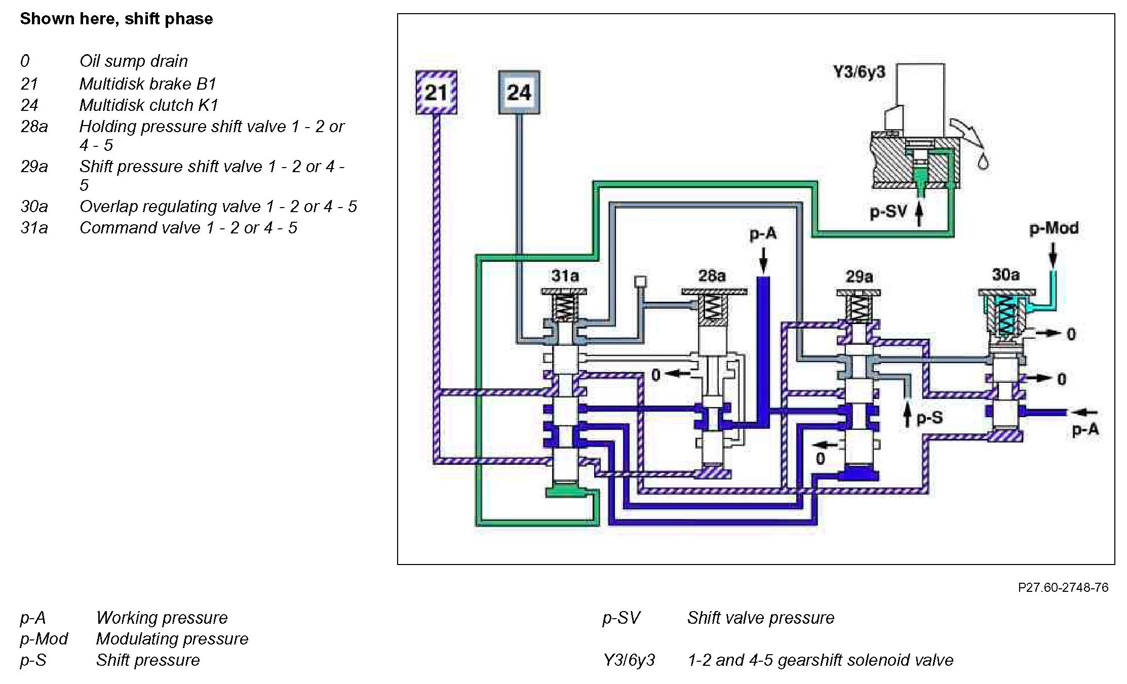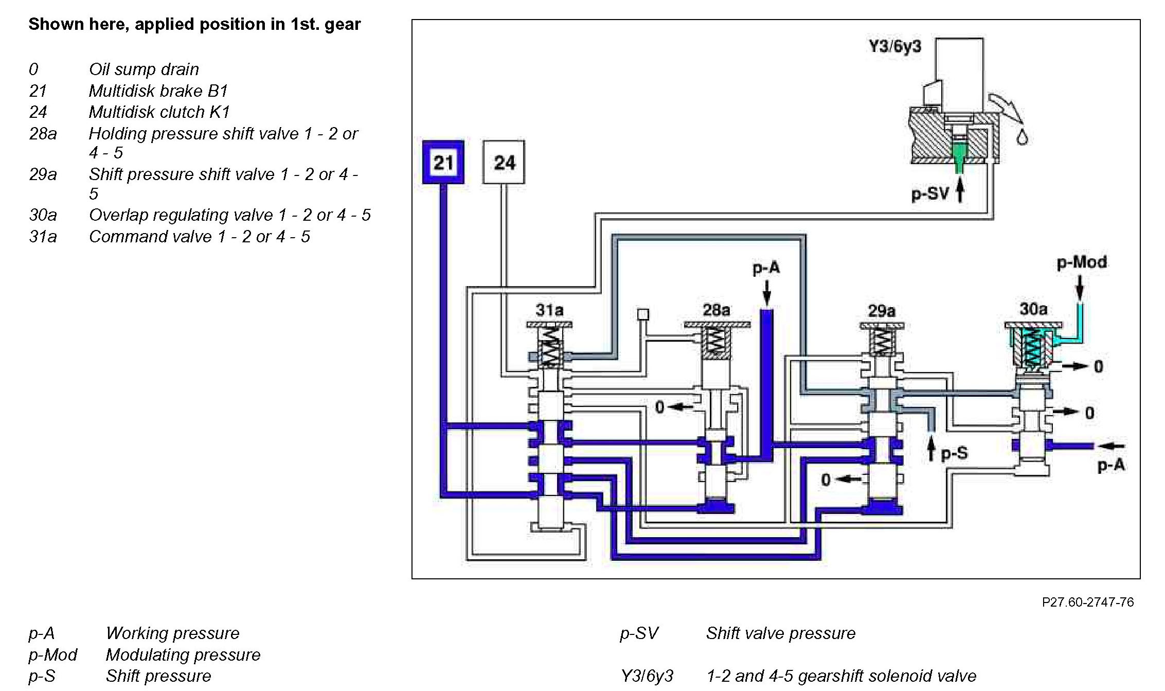 After a successful gear change the pressure at the face of the command valve 1 - 2 or 4 - 5 (31a) is reduced via the gearshift solenoid valve 1-2 and 4-5 and this is set back to its original position. The working pressure (p-A) is routed via holding pressure shift valve 1 - 2 or 4 - 5 (28a) and command valve 1 - 2 or 4 - 5 (31a) to the multidisk clutch K1 (24).