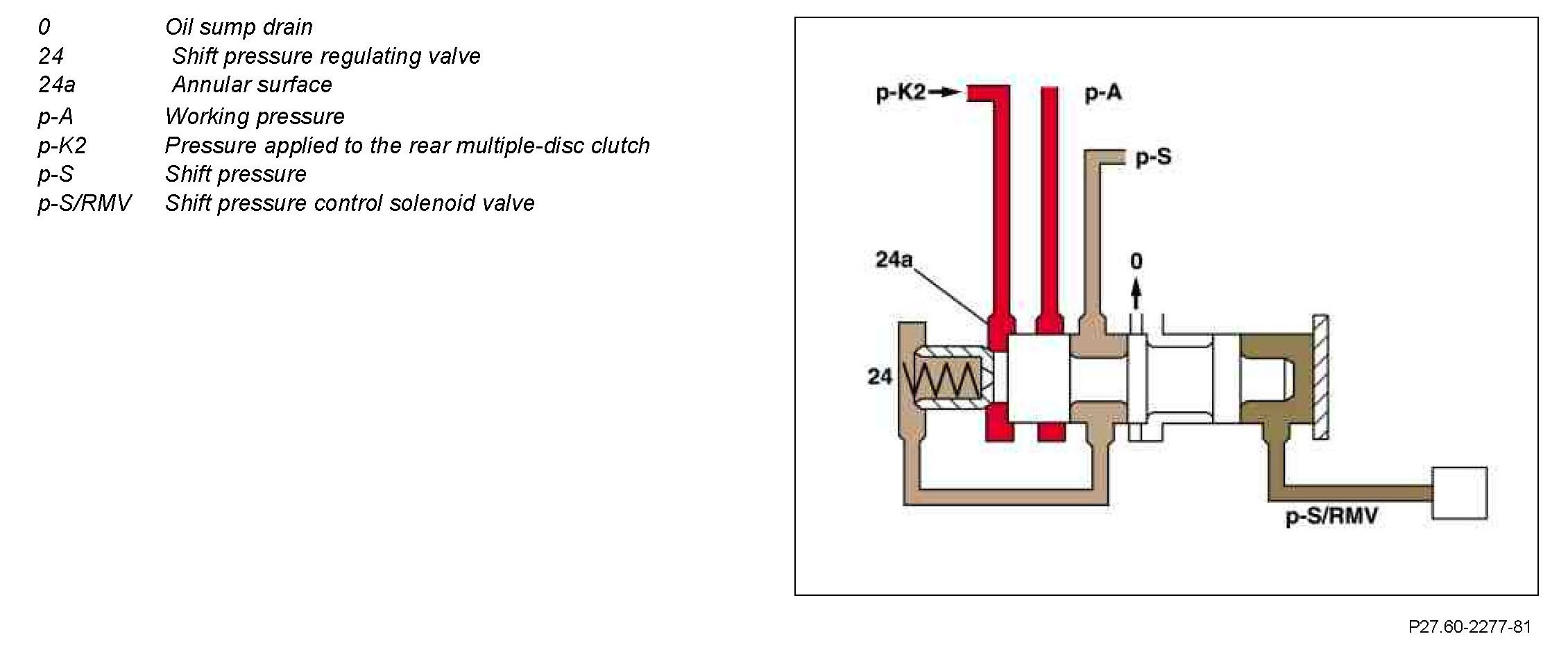 The shift pressure (p-S) is determined by the shift pressure regulating solenoid valve (Y3/6y2) and the shift pressure regulating valve (24). In addition, pressure from the multiple-disc clutch K2 (p-K2) is also present at the annular surface (24a) of the shift pressure regulating valve (24). This reduces the shift pressure in 2nd gear.