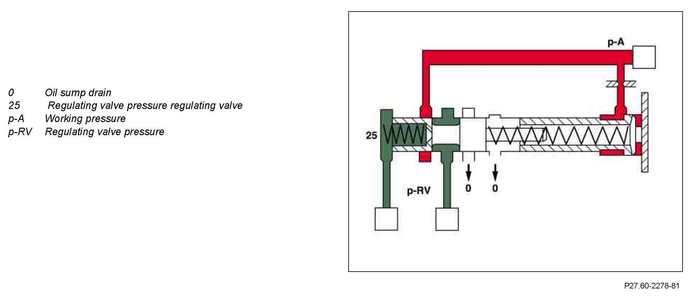 The regulating valve pressure (p-RV) is controlled up to the maximum pressure at the regulating valve pressure regulating valve (25) depending on the working pressure (p-A).