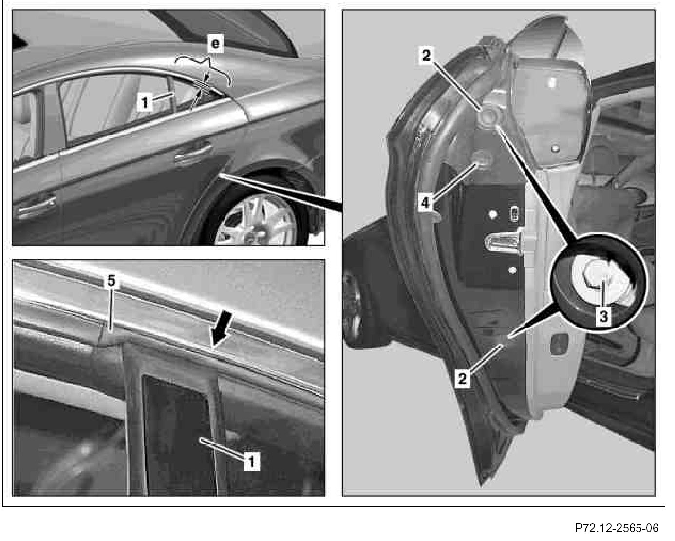 4. Close rear door and raise window guide rail (1) until window guide rail seal (1) makes contact with window seal (5) (arrow) and dimension "e" is adjusted