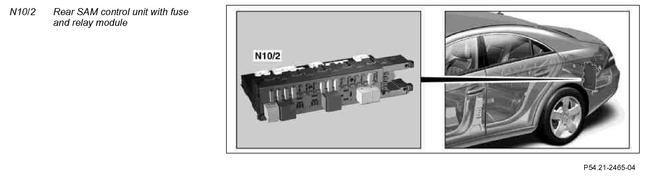 The fuel pump relay (N10/2kA) is located on the rear SAM control unit, but is actuated by the ME-SFI [ME] control unit (N3/10) (on vehicles with gasoline engine) or by the CDI control unit (N3/9) (on vehicles with diesel engine).