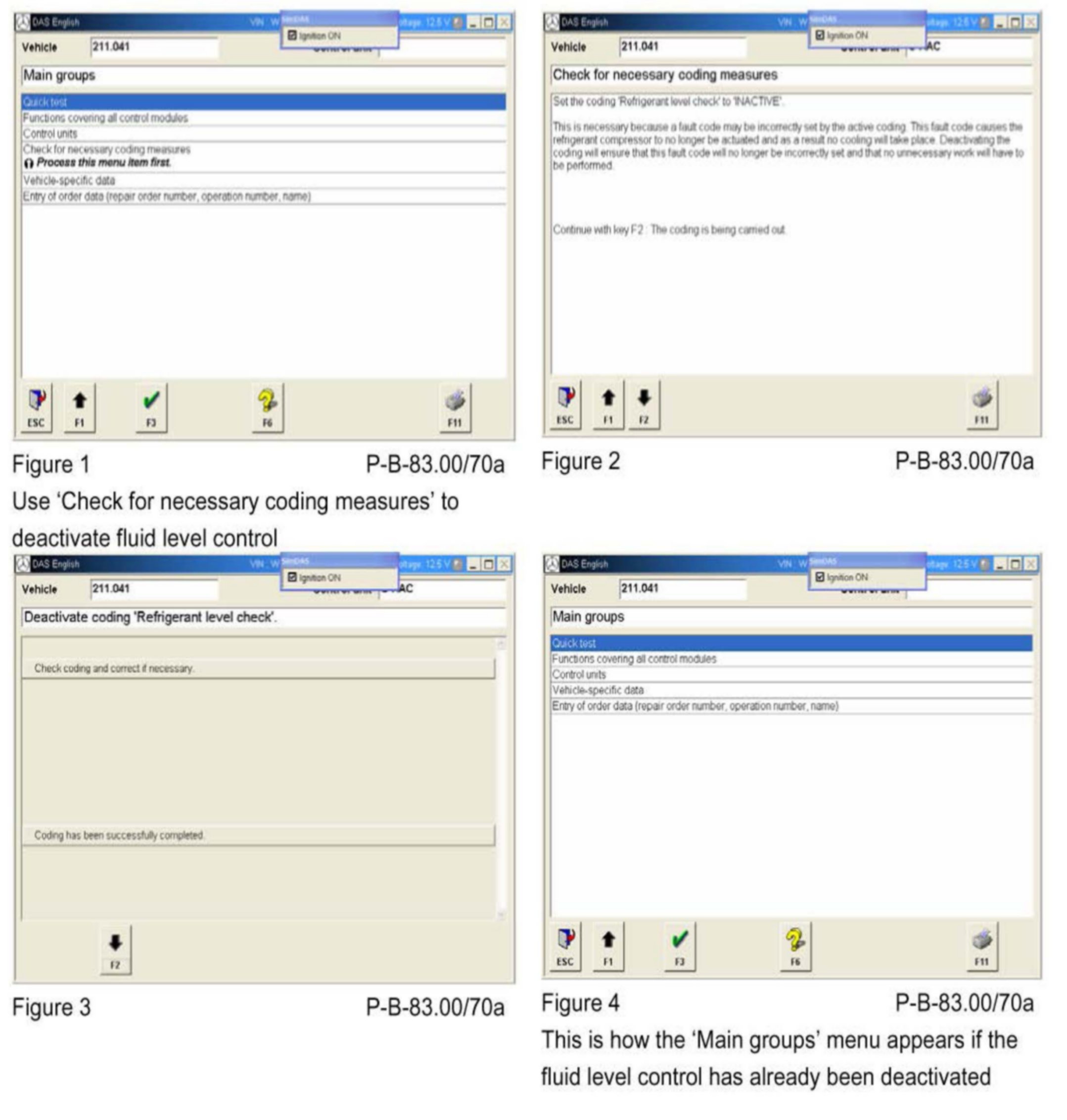 If the fluid level control is still active, there will be a menu item in 'Main groups' labeled 'Check for necessary coding measures' (Figure 1). Process this menu item to deactivate the coding of the fluid level controls (Figure 2 and 3). If the fluid level control is already inactive, this additional menu item will not appear when Main groups is selected (Figure 4).