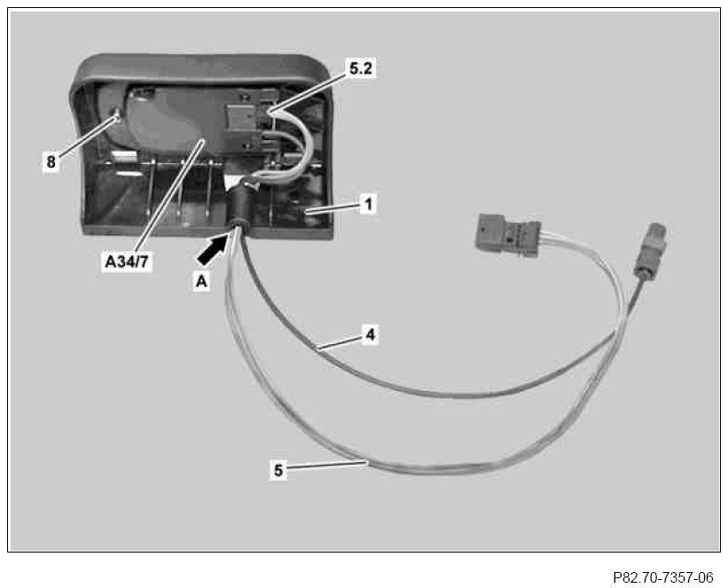 6 Insert Bluetooth module (A34/7) into Bluetooth module holder (1) and route antenna line for Bluetooth module (4), and the extension for the Bluetooth module wiring harness (5), as shown, into the guide (arrow A).