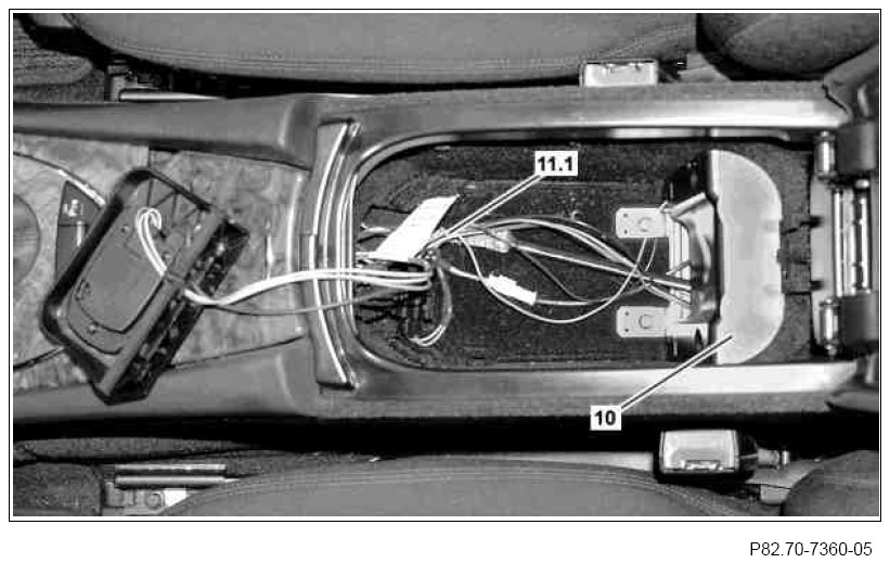 15 Connect electrical connector (11.1) for illumination of stowage compartment in center console.