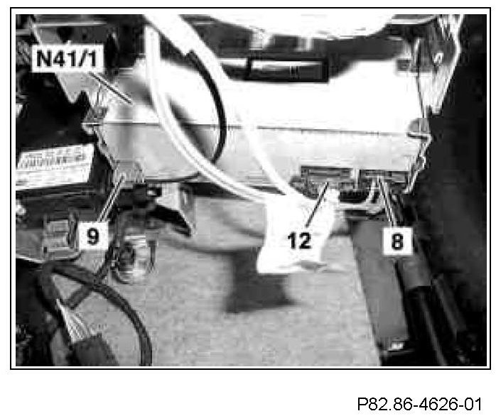 4 Connect the navigation processor coupling (12), MOST coupling (8) and GPS navigation processor coupling (9) to the navigation processor (N41/1).