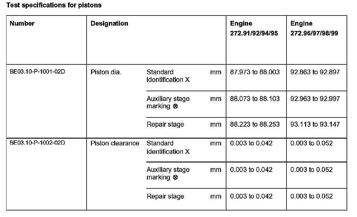 Test specifications for pistons: