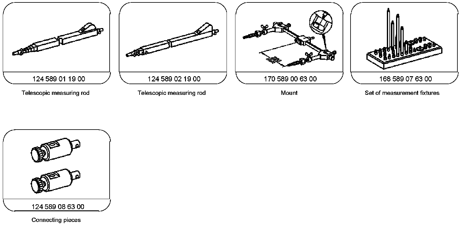 The measuring set is designed in such a way, that the measuring bolts, according to the measuring points at the vehicle, can be screwed together out of mounting bolts, extensions and measuring tips/bolts.