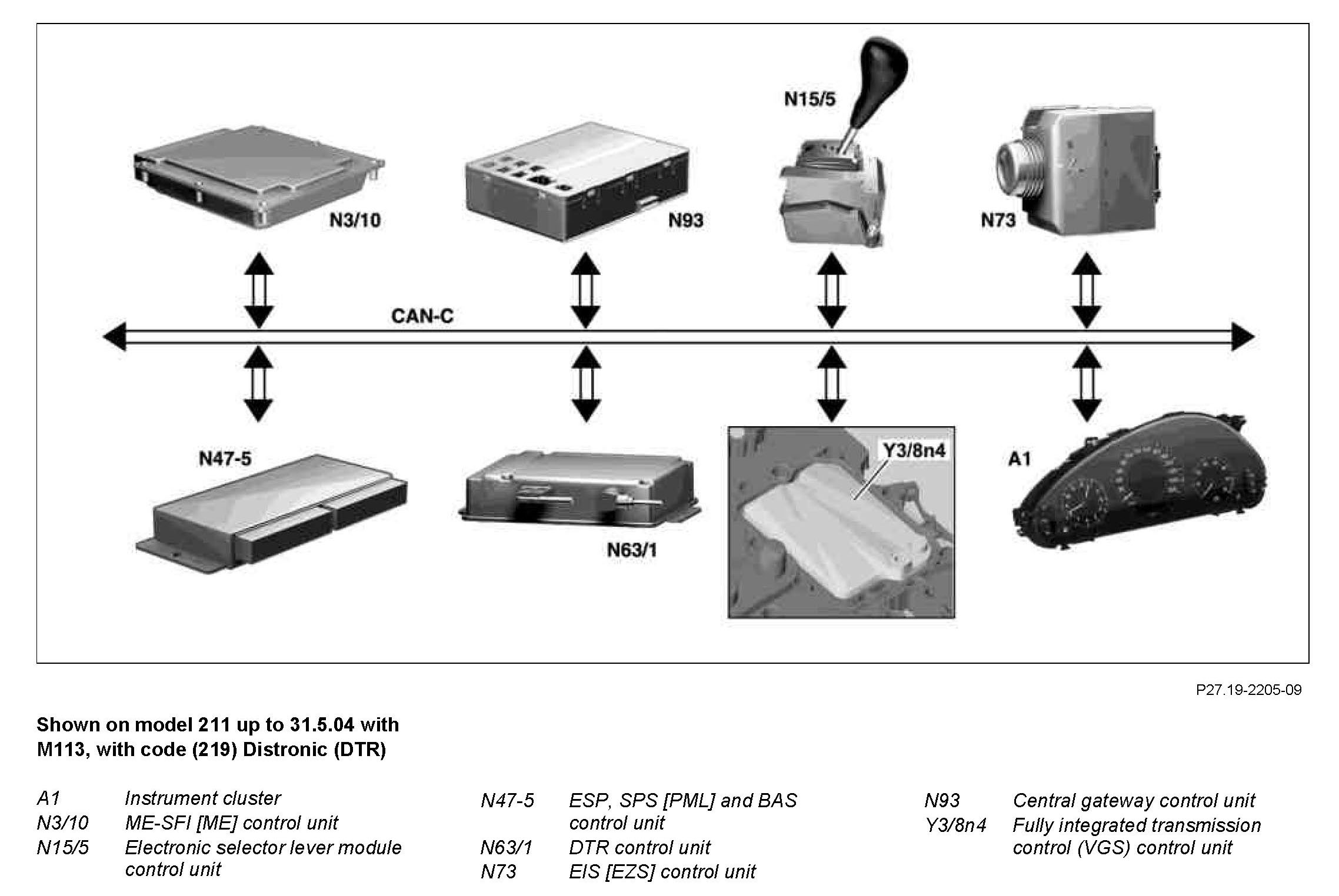 The electronic selector lever module control unit (N15/5) receives digital and analog input signals, converts these and actuates various components or transmits information to various control units via the Controller Area Network bus class C (engine compartment) (CAN-C).