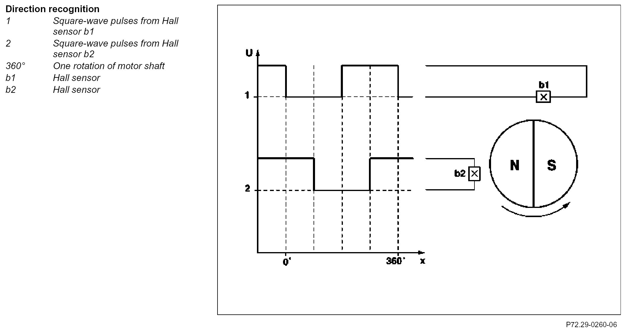 Two Hall sensors (b1, b2) are located on each of the power window motor shafts.They react on the motion of the magnets an transmit a square-wave pulse for each rotation of the motor shaft.The corresponding door control module senses these pulses and evaluates them for rotation direction and position recognition.