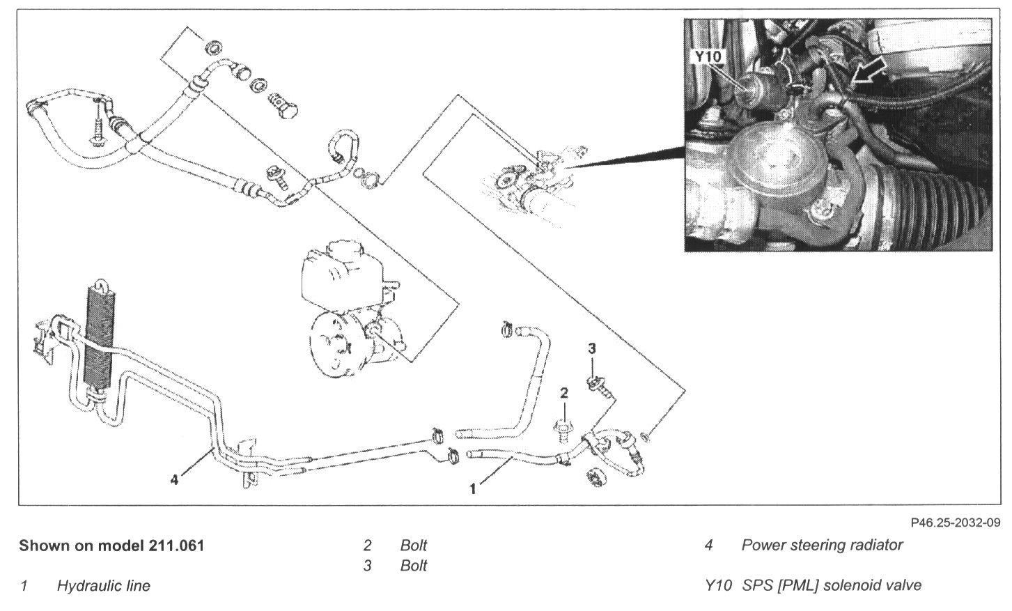 7 Disconnect hydraulic line (1) from radiator (4) of power steering