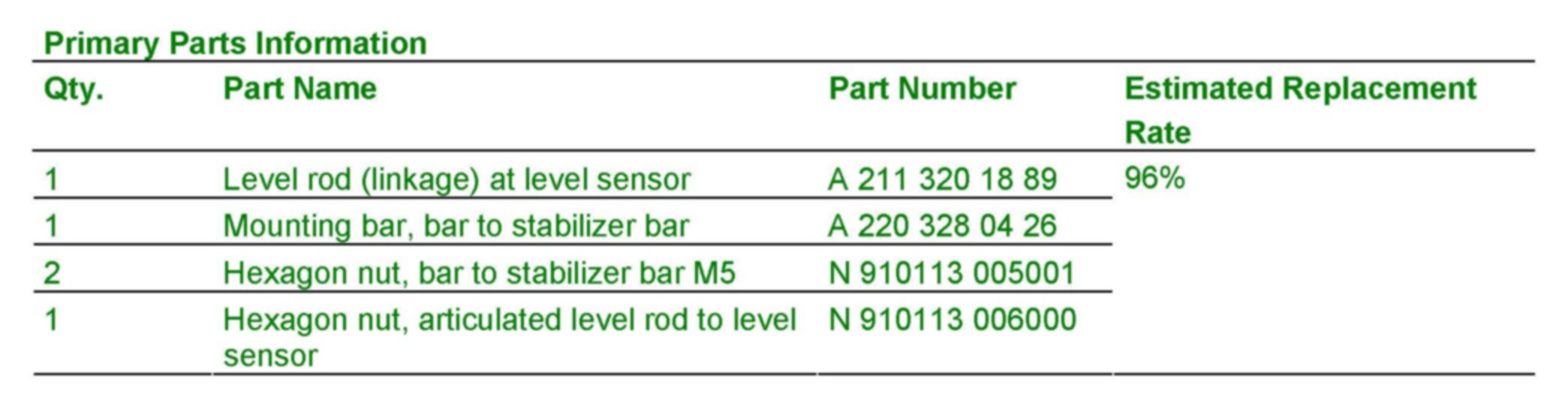 Requests for reimbursement may include parts, labor, fees and taxes. Reimbursement is limited to the amount the repair of level sensor linkage would have cost if completed by an authorized Mercedes-Benz dealer under this campaign.
