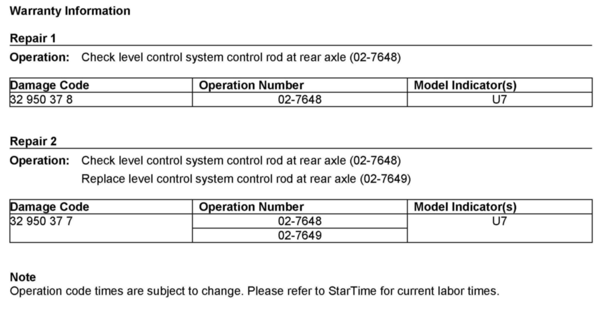 Submit a warranty claim, utilizing Damage Code 32 950 37 8 as a sublet, utilizing the sublet code of "SUB." Sublet repairs require dealer text as stated in the Warranty Policies and Procedures Manual. Repair date should be the date that the customer paid for the repair.