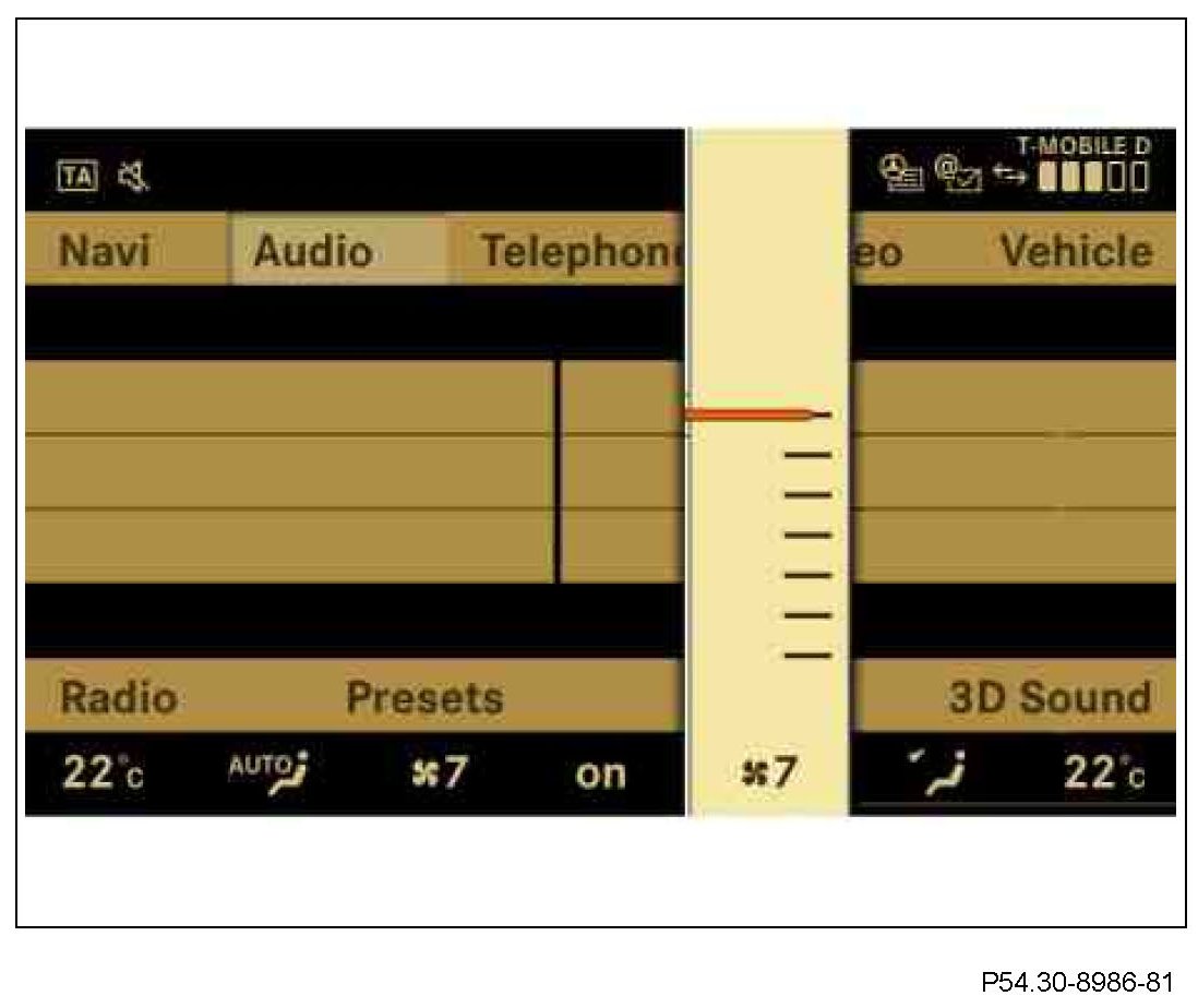 In the air conditioning row the values currently adjusted can be displayed in the COMAND display (A40/8). The values can be set in the air conditioning functions row via the turn/push control (A40/9s11) of the front central operating unit (A40/9).