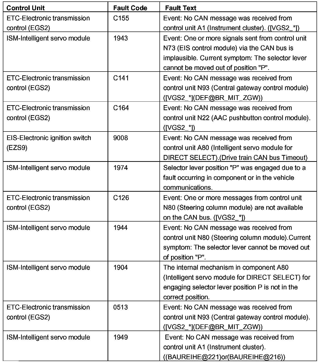 Vehicle Cannot Be Started, CAN Fault Codes Current and Stored
