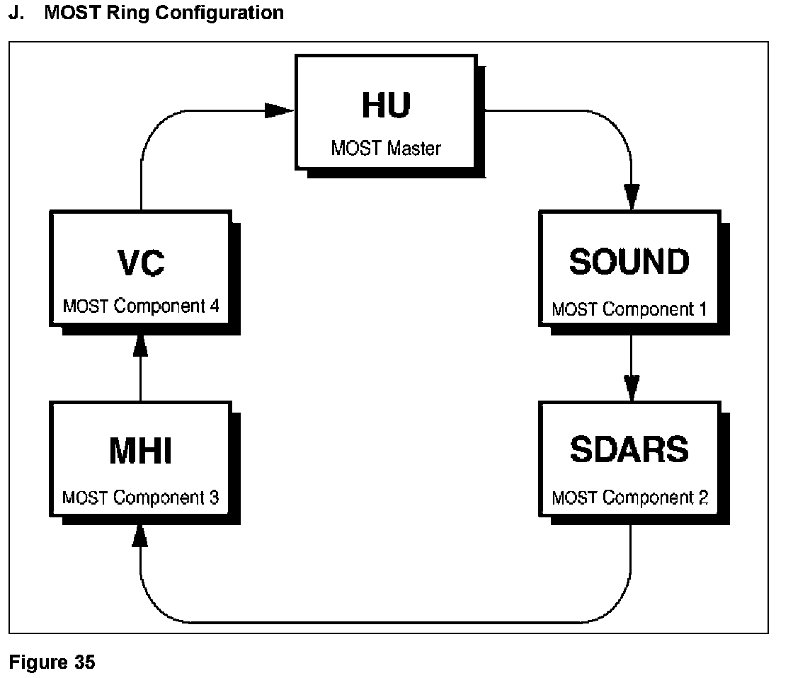 Match the MOST ring configuration to Figure 35. Failure to have the configuration match Figure 35 will result in erroneous system operation and/or intermittent malfunctioning of some or all components. Do not alter the configuration in Figure 35 to match the vehicle configuration.