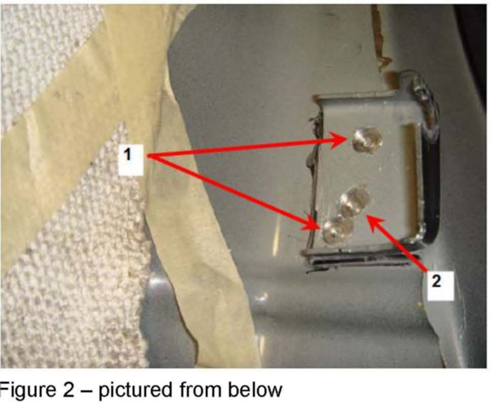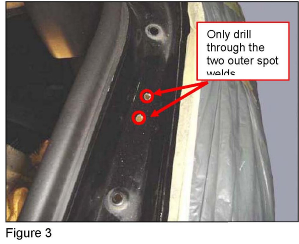 4. Drill out the two outer spot welds (Figure 2, 1) on the mounting console from inside the trunk drill all the way through the console and the vehicle body. Do not drill the center spot weld (Figure 2, 2) at this time.