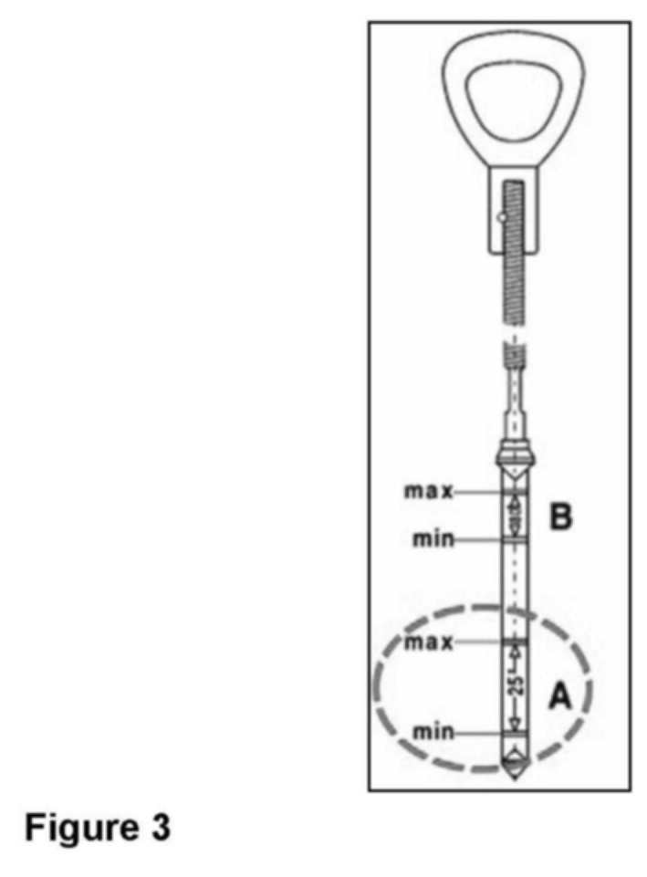 7. Remove breakaway locking tab from dipstick tube cap and check fluid level; the fluid level must be between the min and max marks (A, Figure 3).