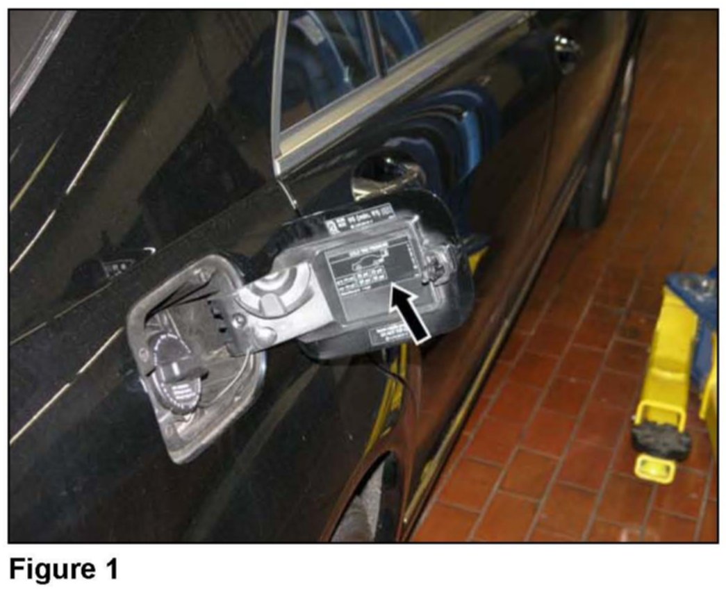 1. Check part number (A221 584 6517) on tire pressure label (arrow, Figure 1) affixed to inside of fuel filler flap:
