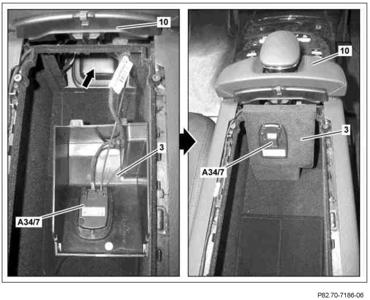 8 Push back comfort telephony wiring harness into opening (arrow) in center console (10).