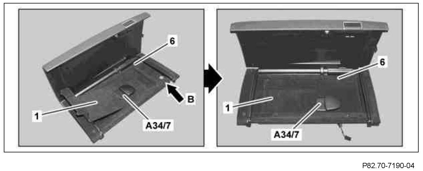 6 Insert paneling (1) with Bluetooth module (A34/7) into stowage compartment in lid (6) and clip in.