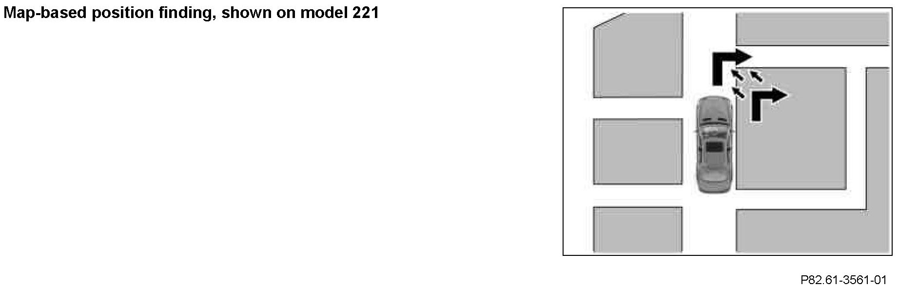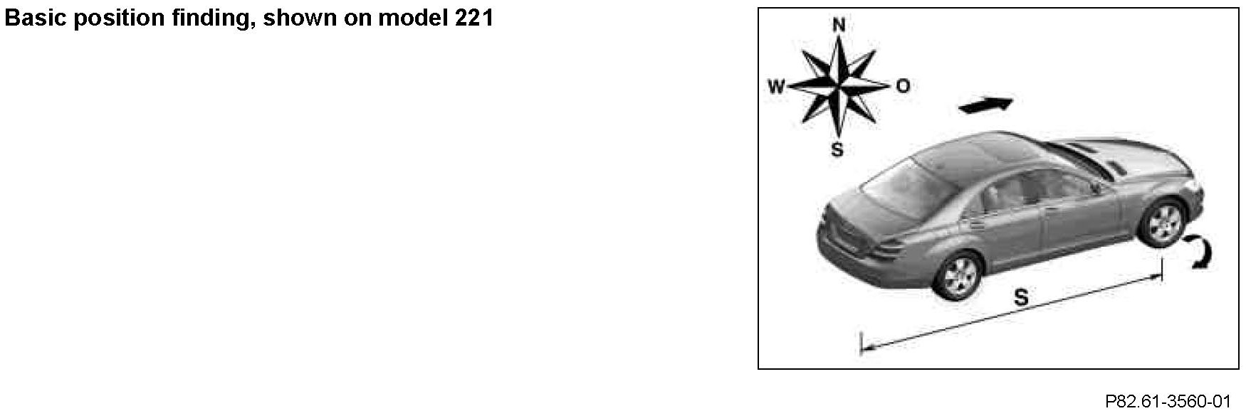 Basic position finding is the basic function of continuous position finding. It is constantly carried out by the integrated navigation processor of the COMAND controller unit as of transmitter key position 0 (circuit 15C ON). The function is shown on the COMAND display in the event of transmitter key position 1 (circuit 15R ON), together with the COMAND controller unit being active and the current vehicle position being requested via the front central operating unit. Basic position finding (dead reckoning) takes place independently from the digitized map.