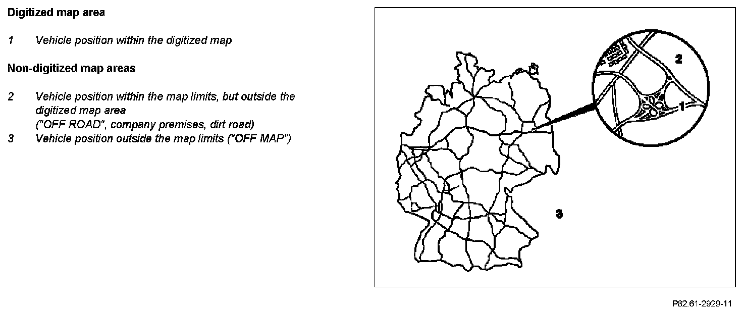 When traveling outside the digitized map area (e.g. company grounds etc.), but still within the map limits, the navigation processor of the COMAND controller unit switches over to "Destination-oriented navigation in non-digitized map area". The message "OFF ROAD" appears on the COMAND display. If in addition, the vehicle is outside the map limits (outside the country), the message "OFF MAP" appears: